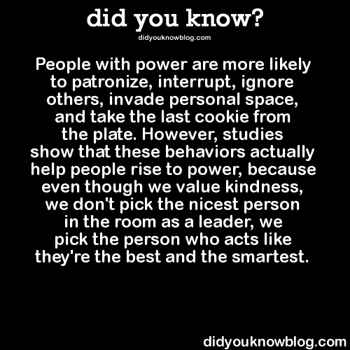 Mi traducción liberal vendría a ser: “Las personas poderosas es más fácil que sean condescendientes, que interrumpan, que ignoren a los demás, que invadan su espacio personal y que cojan la ultima galleta del plato. Pero estudios muestran que estos comportamientos en realidad ayudan a ascender al poder, porque aunque valoramos la amabilidad, no elegimos como líder a la persona más agradable de la sala, sino que elegimos a la persona que actúa como si fuese la mejor y más inteligente”.